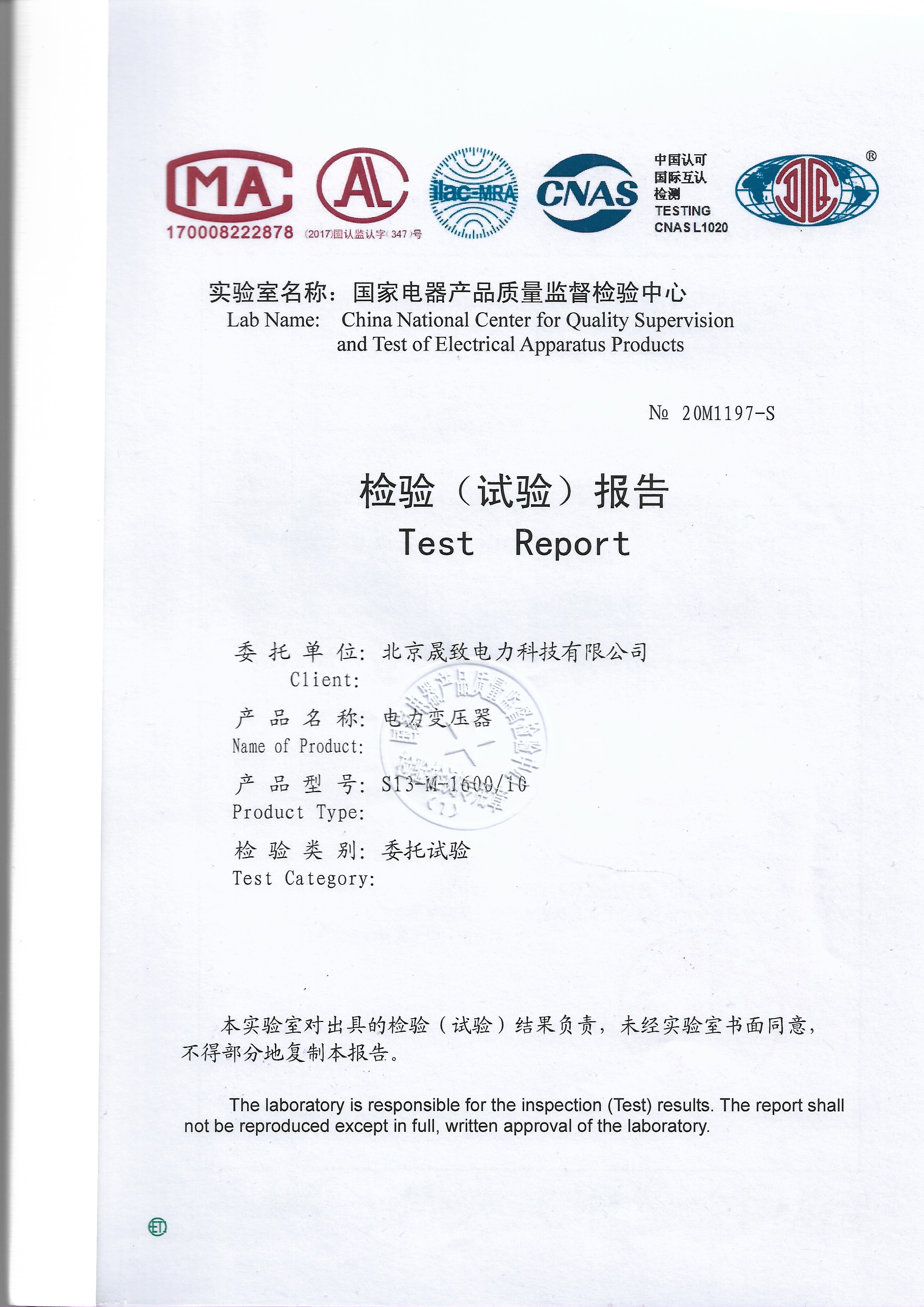 (編號:20M1197-S),查詢真偽網址:http://www.eeti.com.cn/,檢驗報告編號:20M1197-S,委托企業名稱:北京晟致電力科技有限公司。